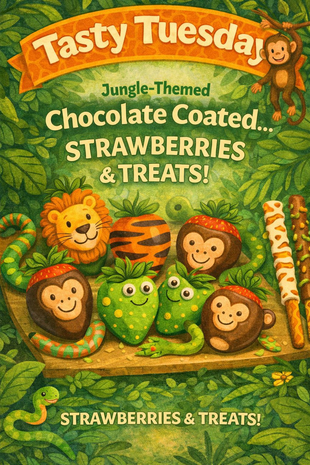 Jungle-themed chocolate coated strawberries and tasty jungle treats.