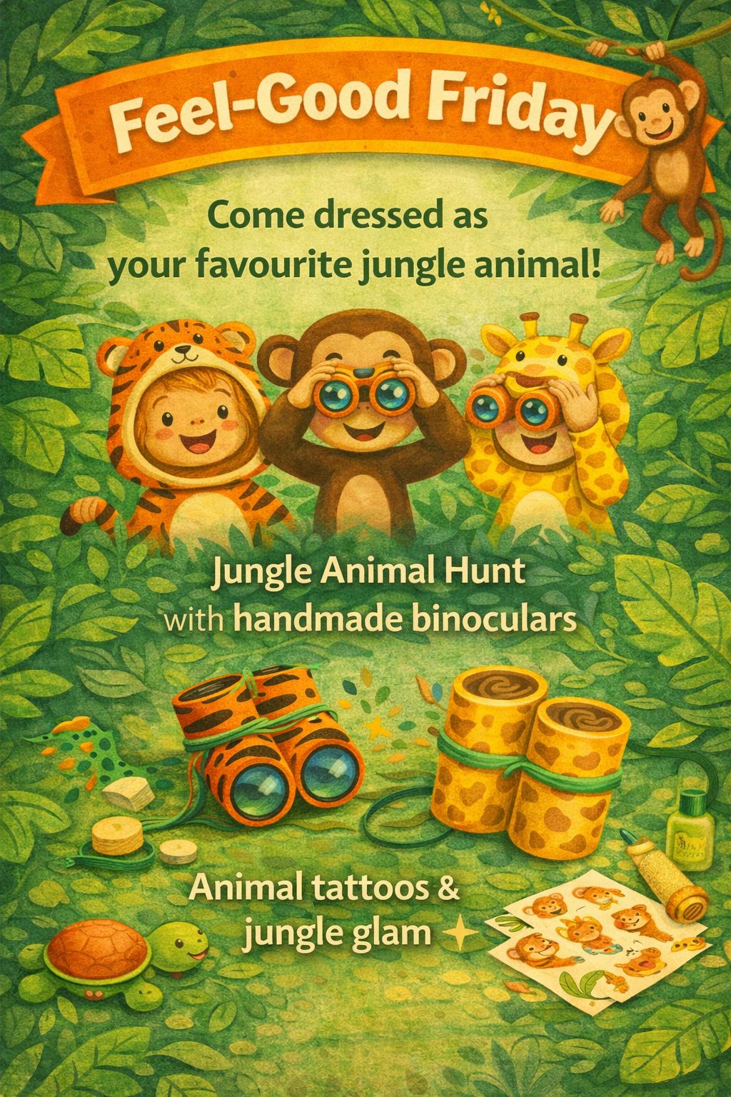 Come dressed as your favourite jungle animal, enjoy a jungle animal hunt with handmade binoculars, plus animal tattoos and jungle glam.