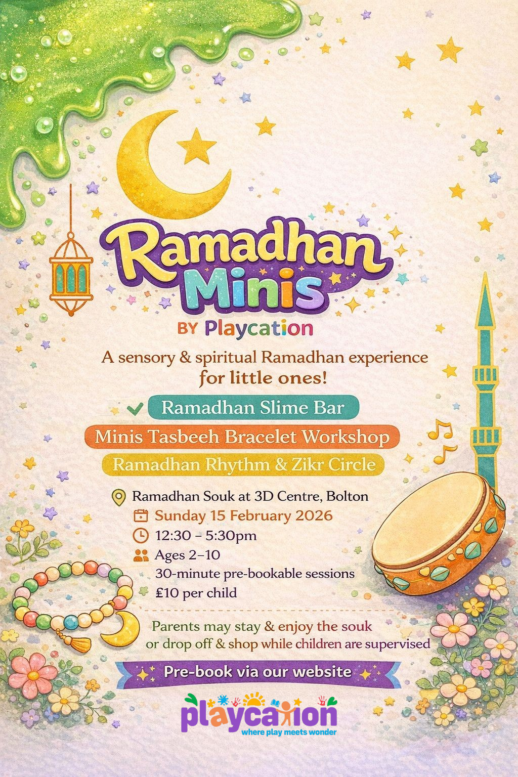 Join us at the Ramadhan Souk in the 3D Centre Bolton for a wholesome, sensory‑rich workshop designed especially for little hands and curious hearts. Ramadhan Minis by Playcation brings together creativity, spirituality and play in a way children will love and parents will appreciate.